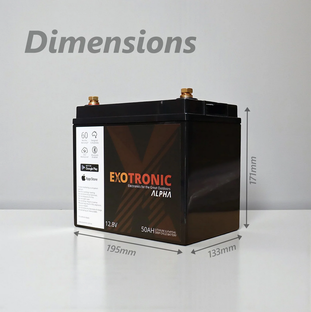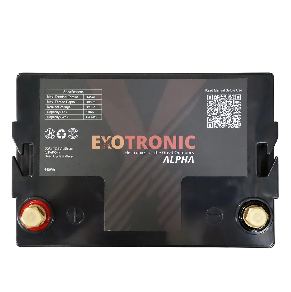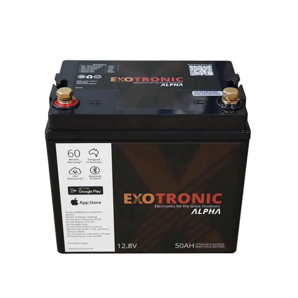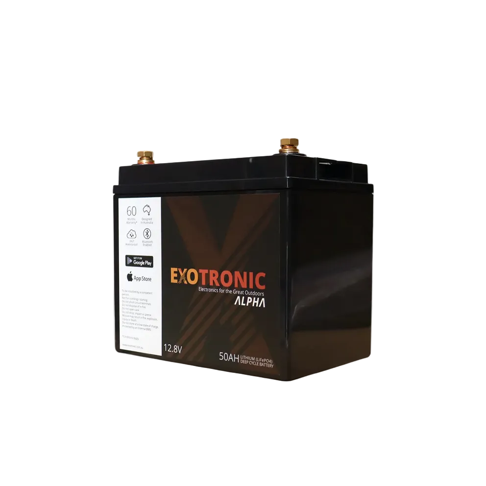 Whether powering a compact solar setup, supporting marine electronics or upgrading a caravan battery bank, the Exotronic 12V 50Ah Alpha Series delivers efficient, durable and intelligently monitored lithium performance.