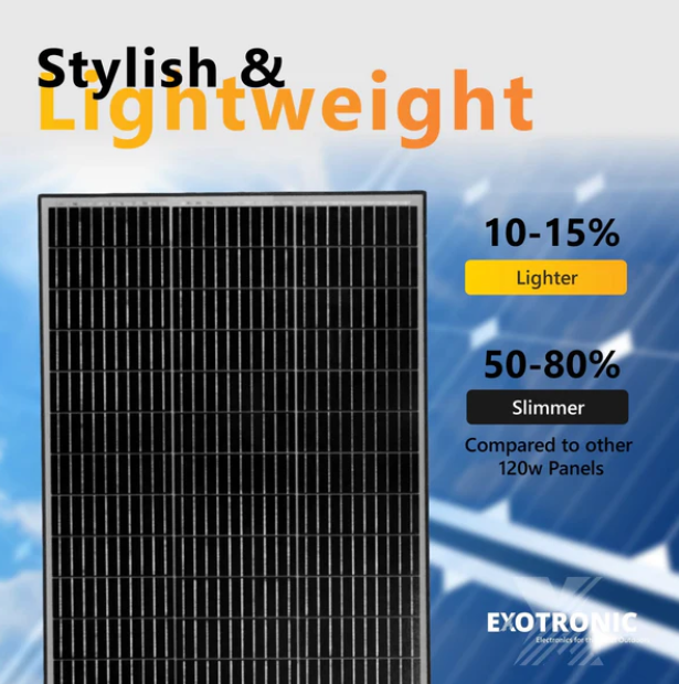 The Exotronic Horizon Series 120W solar panel is engineered with advanced G12 Mono-PERC cells, delivering high output efficiency in a compact, durable design suited to 4WD touring, caravans, camper trailers, marine applications and off-grid power setups. With an industry-leading 23% efficiency rating and a cut-cell, low-loss busbar layout, this 120W panel maximises energy harvest in variable light conditions, increasing real-world performance.