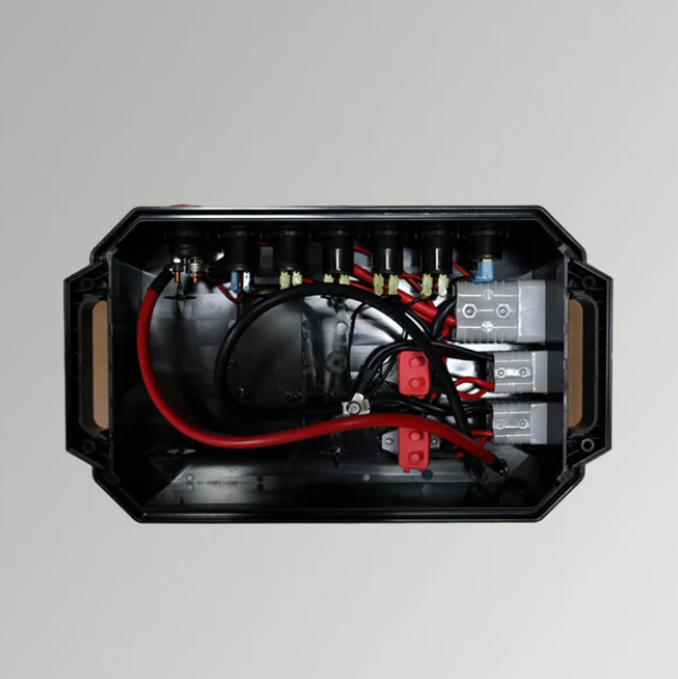 The Exotronic Qi-Enabled Heavy Duty Portable Battery Box is built from UL 94V-0 fire-resistant ABS plastic to handle demanding environments. It securely houses batteries up to 160Ah, providing a reliable portable power hub for touring, camping, or backup use.