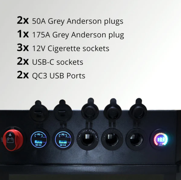 Designed to suit AGM, Gel, and Lithium batteries up to 35kg, delivering safe, reliable energy with modern convenience features like wireless charging, dual USB ports, x4 Anderson plugs and a built-in digital display. A rugged, all-in-one power station for 4x4, camping, and off-grid setups.