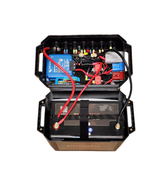 The Exotronic Pre-Wired Battery Box 180 Ah includes a full suite of connection options to support everything from fridges and inverters to lighting and communications gear.