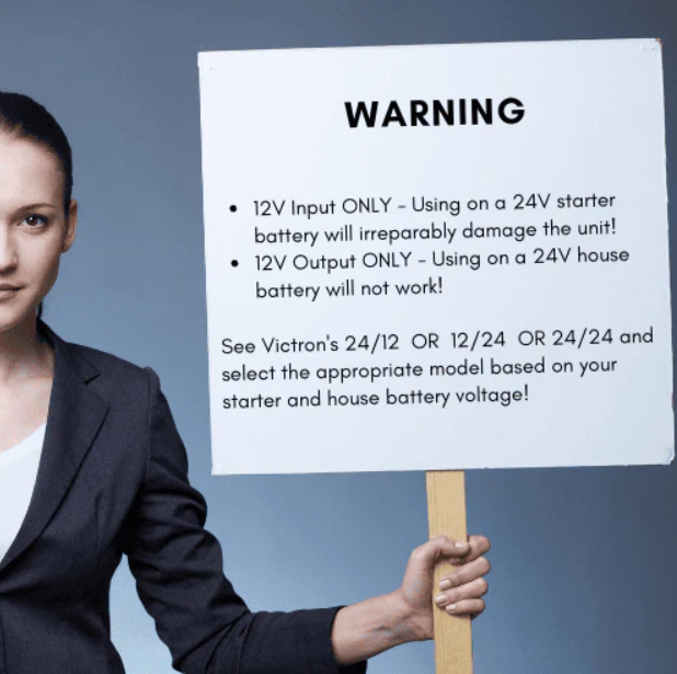 WARNING: This model is specifically designed for 12V to 12V charging systems. Do not use it with 24V or mixed-voltage systems — doing so may cause permanent damage.